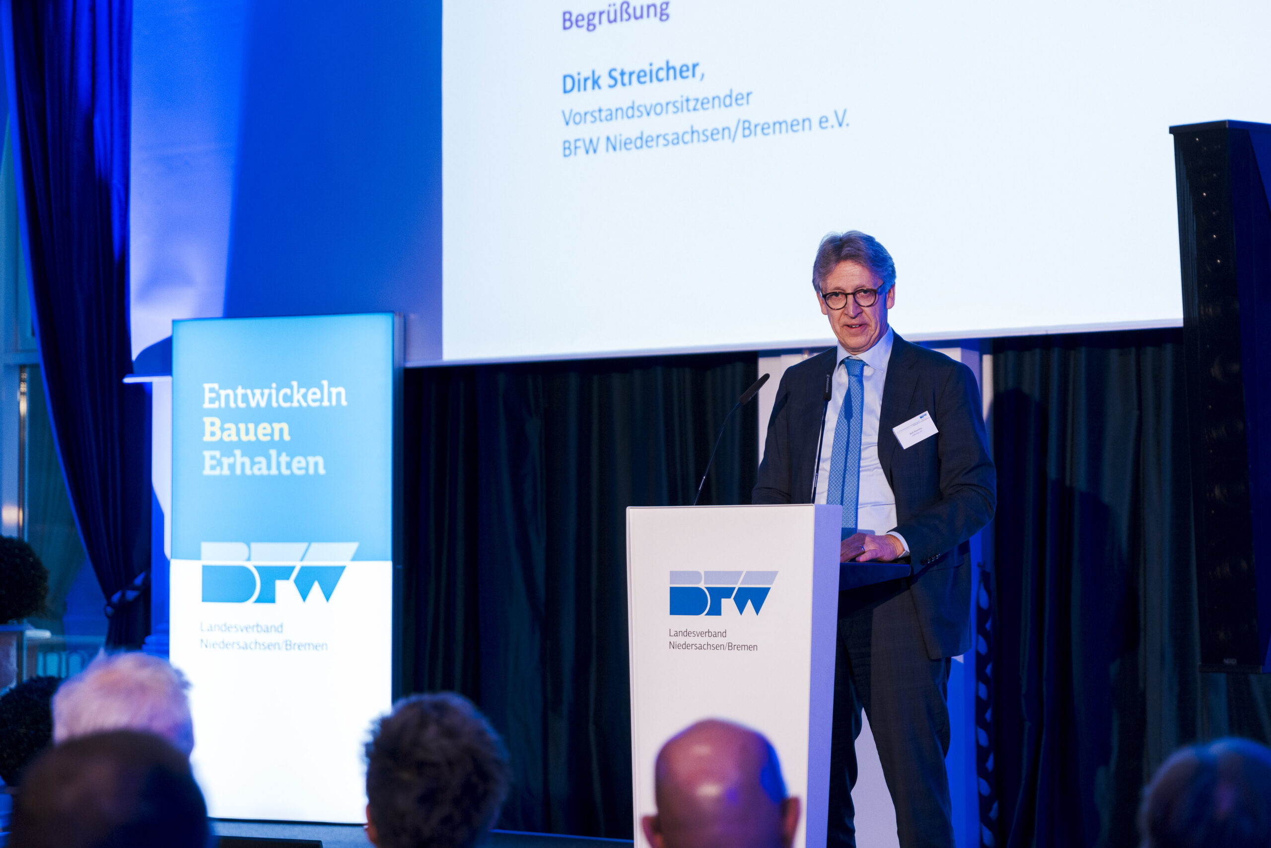 „Wir müssen uns wieder mehr zumuten“, mit klaren Worten eröffnete Dirk Streicher, Vorstandsvorsitzender des BFW Niedersachsen/Bremen, den Abend. Er mahnte, dass die anhaltend schwierige Lage der Bauwirtschaft ein gemeinsames kraftvolles Handeln erfordere und verwies auf den Handlungsdruck: „